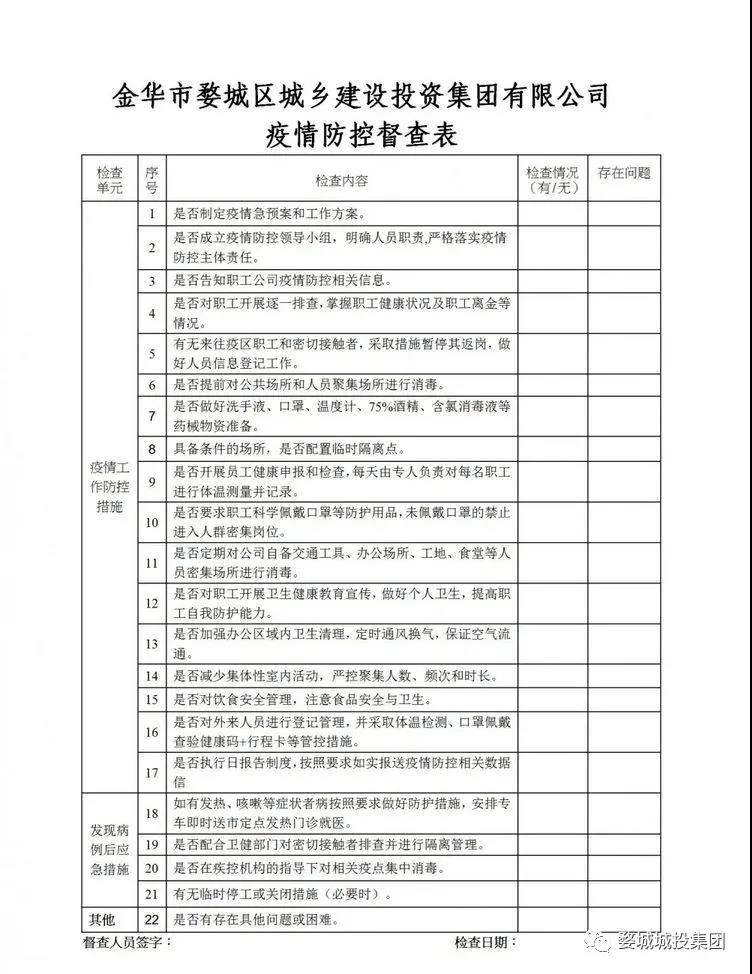 一是由集團(tuán)疫情防控工作領(lǐng)導(dǎo)小組常務(wù)副組長(zhǎng)陳中山牽頭成立督導(dǎo)檢查組,下設(shè)4個(gè)督查小組,督導(dǎo)小組成員放棄周末休息時(shí)間、不舍晝夜分赴在建工地、物業(yè)小區(qū)、文旅項(xiàng)目、高速路口、醫(yī)院門崗等重點(diǎn)區(qū)域督導(dǎo)檢查集團(tuán)疫情防控工作落實(shí)情況,重點(diǎn)督導(dǎo)檢查領(lǐng)導(dǎo)批示指示要求、重點(diǎn)工作、防控措施和應(yīng)急預(yù)案的落實(shí)情況,認(rèn)真組織核查并及時(shí)報(bào)送防控核查信息。二是完善修訂《集團(tuán)疫情防控規(guī)范及工作制度》、《集團(tuán)疫情防控督查表》,明確工作職責(zé)、強(qiáng)化規(guī)范管理,確保督查效率。三是督促建立健全疫情防控臺(tái)賬,明確督查重點(diǎn),狠抓任務(wù)落實(shí)。